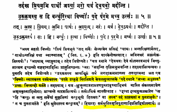 Let’s see Sayan bhasya for the Vedic mantras which declare ‘Vishnu as supreme’ and ‘abode of Vishnu as supreme’. Sayan clearly says that Vishnu here is one mentioned in Itihaas and Purana.