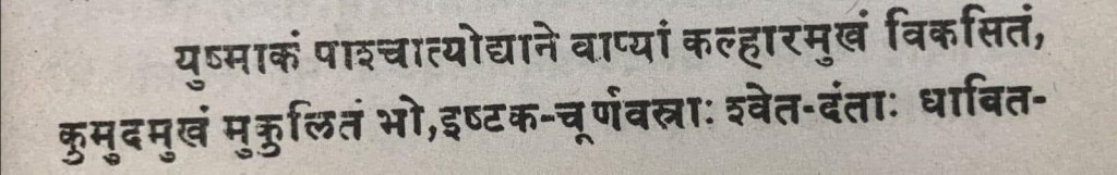 अपने घर के पिछवाड़े के तालाब में प्रातः की सुचना देते नीलकमल मुरझा गये है, लाल कमल दल खिल रहे है, सन्यासी काषाय वस्त्र धारण किये, जिनके मुख की धवल दन्त पंक्ति दृष्टिगोचर हो रही है, मंदिर की तरफ प्रस्थान कर रहे है, मंदिर के किवाड़ खुलने के प्रतिक में शंखनाद कर रहे है।