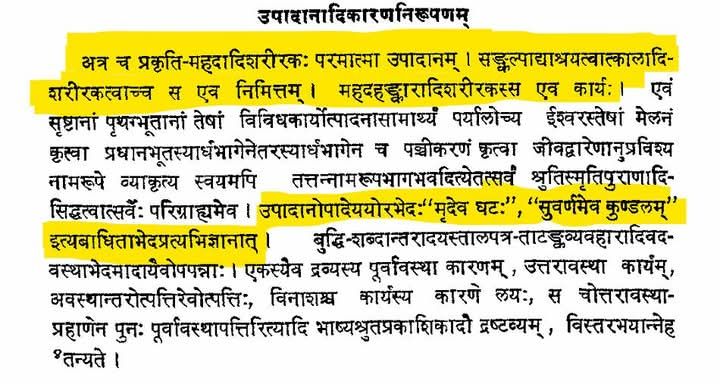 There is no difference between the kaarana and kaarya or, in other words: upaadana (material cause) and upaadeya (product) are one and the same i.e., Bhagwan. Like, Mud and the pot are one and the same. Gold and Golden ornaments are one and the same. On looking at the pot and ornament, we say that it is mud or gold, respectively. There is no hindrance in this identification. Bhagwaan is both Upasana and update i.e. Bhagwan who is a mool-prakriti shareer, transforms into a Mahat etc shareer.