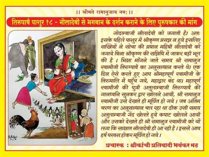 आज 18वीं गाथा में गोदाम्बा नप्पिनै (नीला देवी) को उठाती हैं। 17वीं गाथा में बलदेव के बाद कृष्ण को उठाया किन्तु कृष्ण उठे नहीं। गोपियों को अपनी भूल समझ आयी। उन्होंने कृष्ण से पूर्व उनकी महिषी/प्रिया नप्पिनै को नहीं उठाया था। वो उनकी सखी भी थीं और कृष्ण की परम प्रेयसी भी।