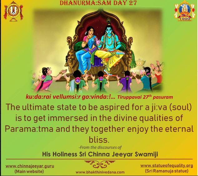 आज 27वीं गाथा में गोदाम्बा भगवान को अक्कार-अडिसल नामक क्षीरान्न का भोग लगती हैं। इसकी सामग्री एवं विधि स्वयं इस गाथा में बताती भी हैं। इसका गूढ़ार्थ ‘सायुज्य‘ है। पूर्व में वो सालोक्य तो प्राप्त कर ही चुकी हैं। ‘सारूप्य’ 26वीं गाथा में मिल गया। सारूप्य अर्थात भगवान के समान रूप का हो जाना। चतुर्भुज होकर शङ्ख-चक्र धारण किये होते हैं नित्य और मुक्त।